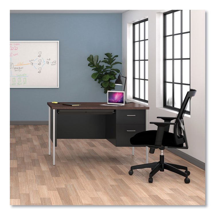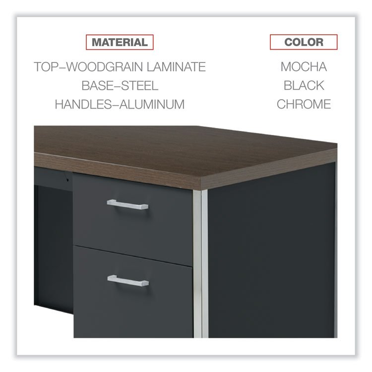 Solid and stable desk with square edge laminated top that is scratch and stain-resistant. Built with a durable, powder-coated steel frame with 1″ square tubular steel legs. Standard features include full extension ball-bearing drawer slides for smooth drawer action, central locking center drawer, and a strong laminate wood top. Desks ship fully assembled except for the legs. All necessary hardware to attach the legs is included. Designed to meet or exceed ANSI-BIFMA industry standards for performance and workmanship. Chrome-Plated Legs. Worksurface/Base Color: Mocha/Black; Color Family: Brown; Worksurface Shape: Rectangular; Worksurface Material: Woodgrain Laminate.