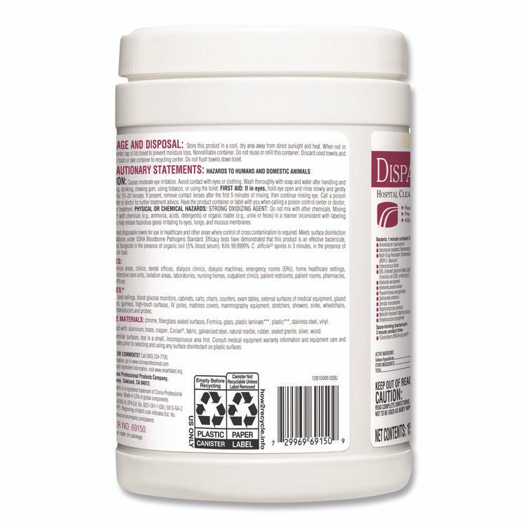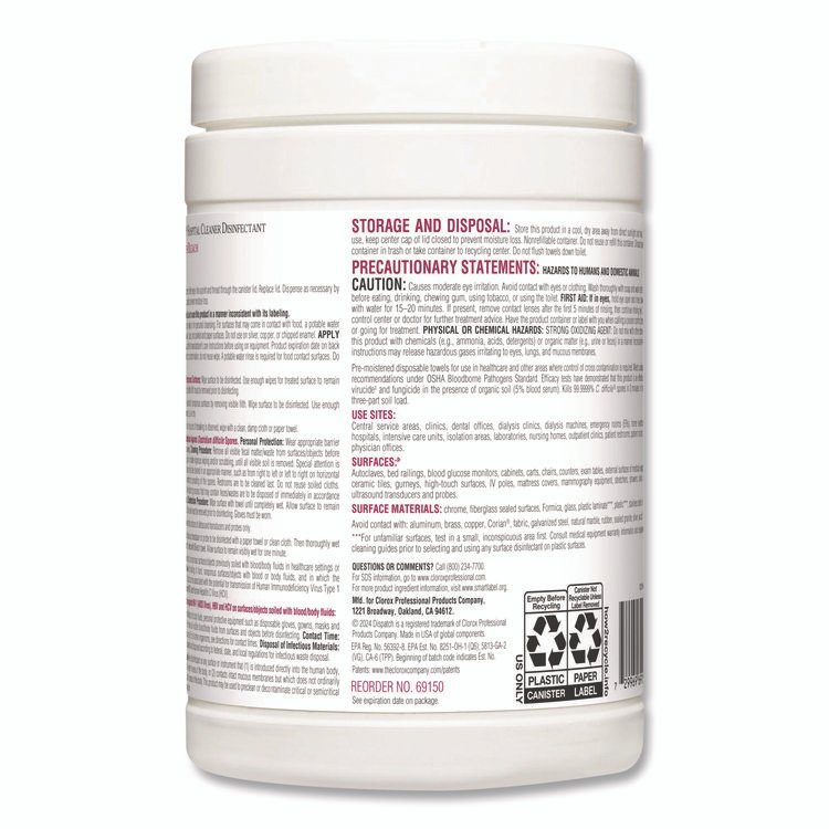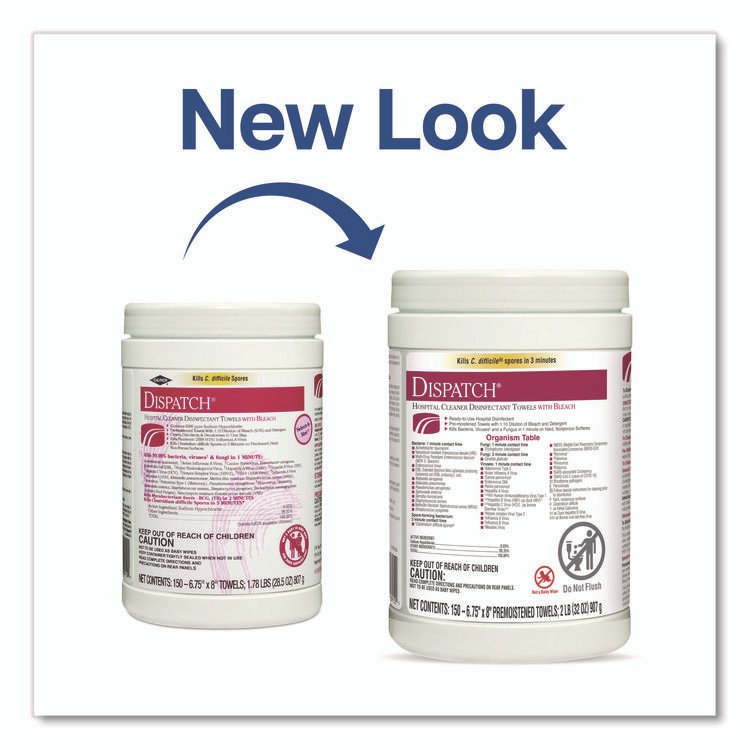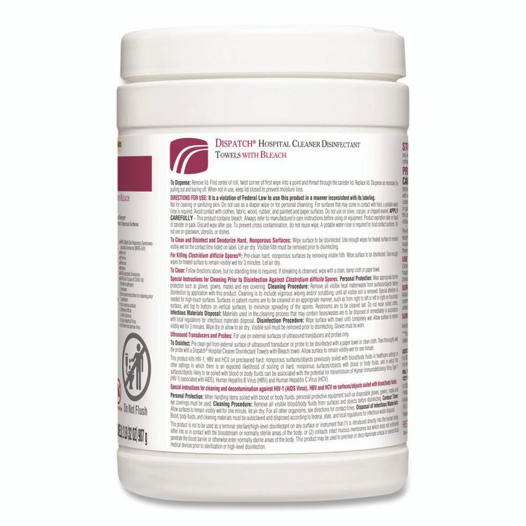 Worry less with Dispatch® Hospital Cleaner Disinfectant Towels with Bleach, designed for hospitals and recommended in cleaning and care guides for disinfecting hospital equipment. These intermediate level hospital bleach wipes kill C. difficile, MRSA, VRE and other pathogens on medical use surfaces in three minutes or less when used as directed, plus they help reduce the spread of HAIs. Dispatch® Hospital Cleaner Disinfectant Towels come with a light scent for patient and staff comfort. Recommended in cleaning and care guides for disinfecting ultrasound probes, blood glucose meters and infusion pumps. Meets CDC, CMS and OSHA guidelines for cleaning and disinfecting surfaces in healthcare facilities. A precleaning step is required to kill Clostridioides difficile and Candida auris. For unfamiliar surfaces, test in a small inconspicuous area first. Consult medical equipment warranty information and equipment care and cleaning guides prior to selecting and using any surface disinfectant. Towel/Wipe Type: Disinfecting Wipes; Application: Hospitals; Medical Facilities; Nursing Homes; Applicable Material: Acrylic; Ceramic; Chrome; Fiberglass; Glass; Metal; Plastic; Tile; Vinyl; Wood; Material(s): Nonwoven Fiber.