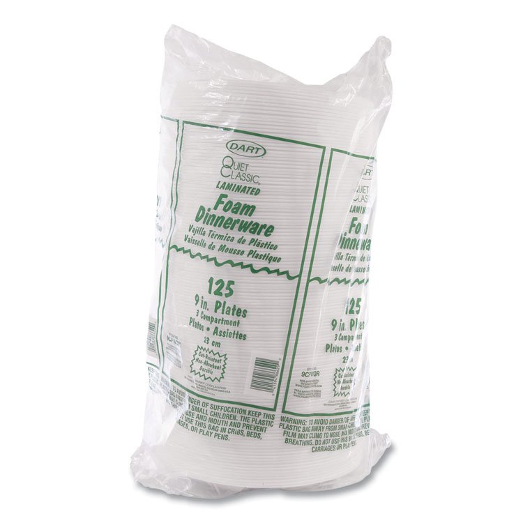 Sturdy foam dinnerware can hold a full portion of food without breaking or bending. Features a smooth, non-absorbent surface. Ideal for hot or cold entrees. Three-Compartment Plate. Dinnerware Type: 3-Compartment Plate; Material Type: Foam; Material(s): Extruded Polystyrene; Shape: Round.