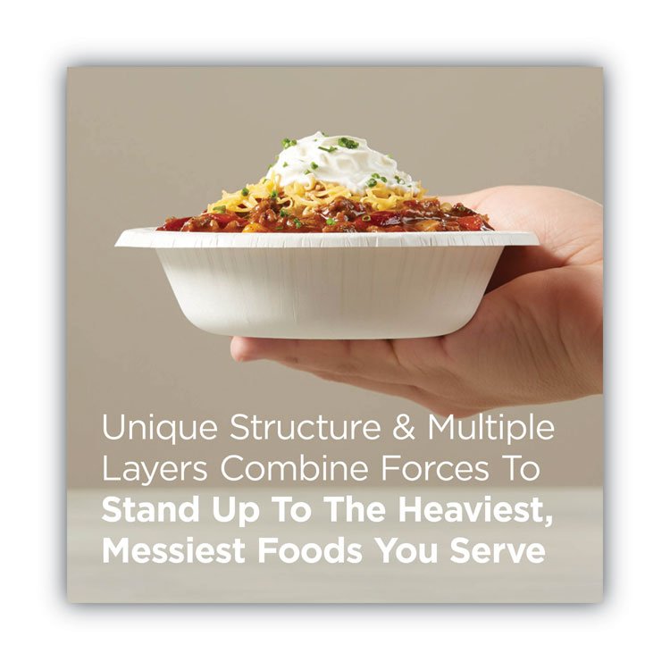 Moisture resistance, grease resistance and dry and wet rigidity make Dixie Ultra® Heavy-Weight Paper Bowls the right choice for the heaviest, messiest foods you serve. The unique structure and multi-layer coatings give these disposable paper bowls their strength, while the Soak-Proof Shield helps keep moisture and grease from leaking through. The Pathways® design matches other Dixie Ultra® plates, platters, bowls and cups to create an attractive, coordinated look. These heavy-duty paper bowls are ideal for foodservice and special events, and because they’re microwaveable and cut-resistant, these small paper bowls come in handy in kitchens and breakrooms. WiseSize. Dinnerware Type: Bowl; Material Type: Paper; Material(s): Paper; Interior Volume Capacity: 12 oz.
