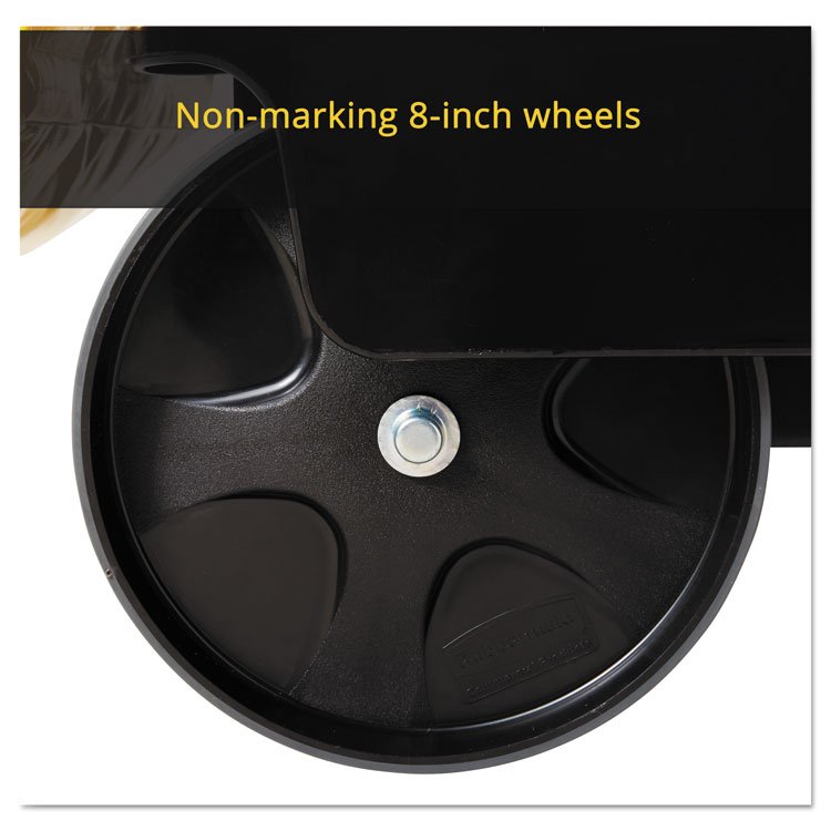 The Rubbermaid Commercial Utility Cart with Zippered Yellow Bag collects waste and transports tools efficiently on 8″ non-marking wheels and 4″ casters. This versatile utility cart has 3 lipped shelves, and a zippered yellow vinyl bag for collecting refuse or launderable items. The surface of the top shelf features tool grips for keeping frequently used items at hand wherever this service cart travels. Material(s): Structural Foam; Overall Material Type: Plastic; Color(s): Black; Color Family: Black.