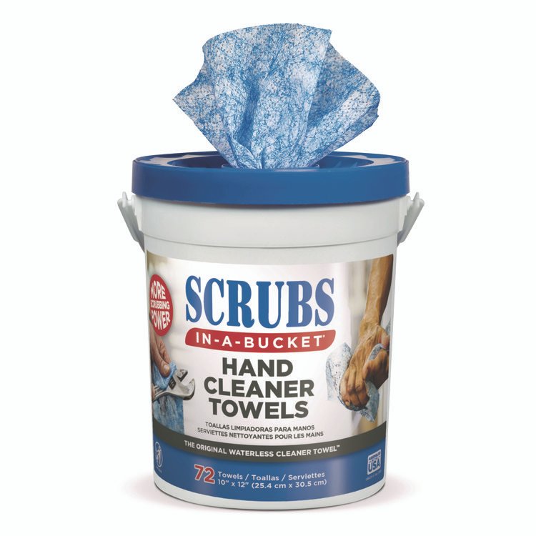 These towels combine an advanced cleaning formula with a strong, dual-textured towel to thoroughly clean hands and surfaces ANYWHERE, ANYPLACE, ANYTIME! The clean, citrus-scented formula loosens and dissolves industrial soils while leaving hands free from dryness and irritation. The Rough Touch blue towel locks in soil to prevent it from transferring back onto hands and surfaces. Hands are left feeling clean with no sticky residue and no rinsing required. SCRUBS in-a-Bucket Hand Cleaner Towels—Value Pack–Stock up and save! Towel/Wipe Type: Hand/Body Wet Wipe; Application: Hand and Surface Cleaning; Applicable Material: Aluminum; Ceramic; Formica; Hands; Hard Surfaces; Plastic; Steel; Tile; Vinyl; Wood; Material(s): Polypropylene.