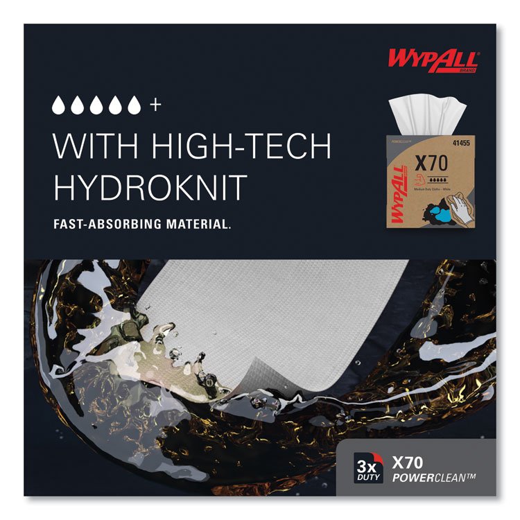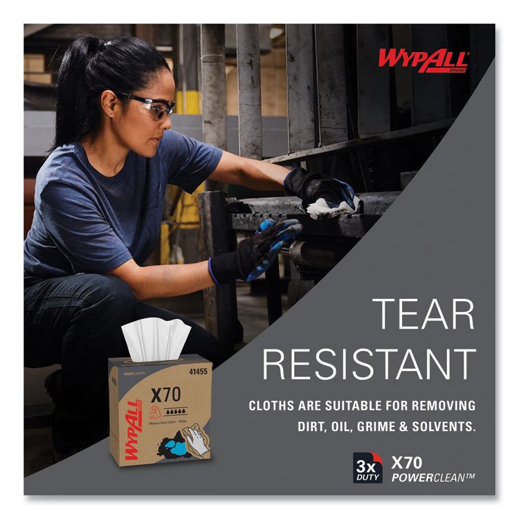 Regardless of your task, industry or budget, our WypAll® wipes, towels and cloths are designed to give you the durability, absorbency and versatility of a laundered cloth with the cost efficiency and hygiene of a disposable. Trust the WypAll* Brand, the one that sets the standard for excellence in wipers. When you’re running a business, it pays to use the very best supplies. If you’ve been using either laundered shop towels or textile shop rags, you can trust Wypall X70 reusable paper towels. They are heavy duty cloths, with high-tech HydroKnit fast-absorbing material. These premium industrial cloths are made of soft pulp fibers, bonded to a polypropylene base sheet for absorbency and tear resistance, making them suitable for removing dirt, soil, grime and solvents in a variety of industrial and manufacturing industries. Plus, they are so sturdy that they can often be used more than once (once you’ve used them a few times, they’re disposable). They are designed to clean surfaces and tools, making them a must-have for the HVAC, automotive, manufacturing and industrial industries. As we look towards the future, Kimberly-Clark Professional is committed to providing a wide collection of essential products and services that help make your workplace exceptional. Our dedication to innovation has helped businesses confidently navigate change and empowered people at work for nearly 150 years and we are committed to do so for years to come. Pop-Up* Box. Towel/Wipe Type: Dry Wipes; Application: General Purpose; Industrial; Material(s): Hydroknit; Color(s): White.